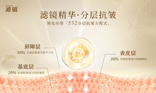 做为主打抗皱功效的产品,滤镜精华除了甄选了多重核心抗皱成分来保证抗皱效果之余,还根据“532分层抗皱方程式”先锋科技,对这些有效成分进行科学配比,并结合,使得作用于屏障层的有效成分比例为50%,作用于表皮层的有效成分比例为30%,作用于基底层的有效成分比例为20%,从而达到系统、全面的抗皱效果。