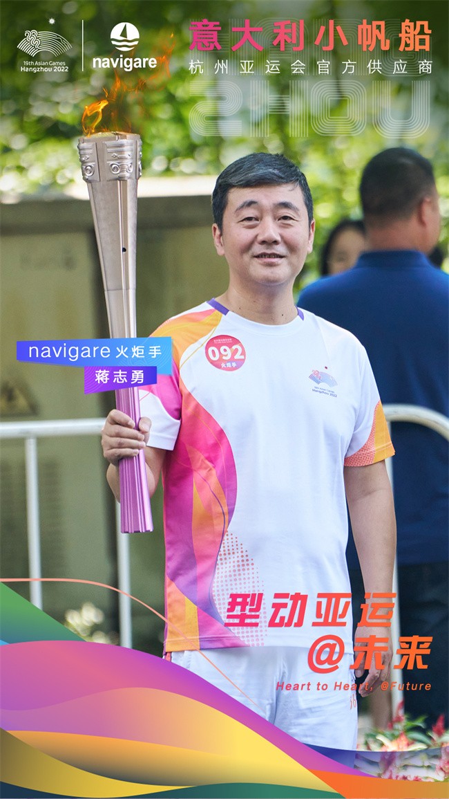 navigare意大利小帆船作为杭州亚运会官方供应商,也有幸受邀参与绍兴站火炬传递。浙江邦格服装有限公司董事长蒋志勇先生担任了亚运会绍兴站92号火炬手,参与火炬传递活动,和大家一起“心心相融,@未来”。